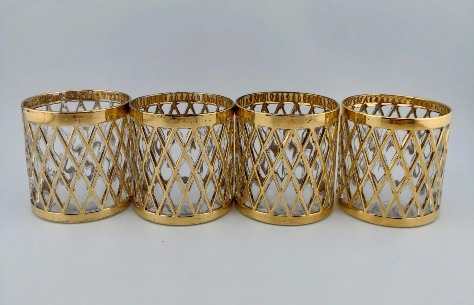 Gorgeous Sekai Ichi Old Fashioned glasses by Imperial Glass Co., set of 4. Some aging and wear, as shown in photos. Height 2.75 inches.