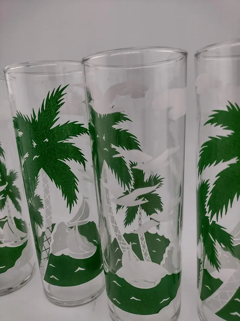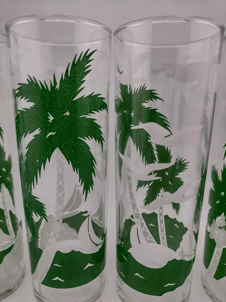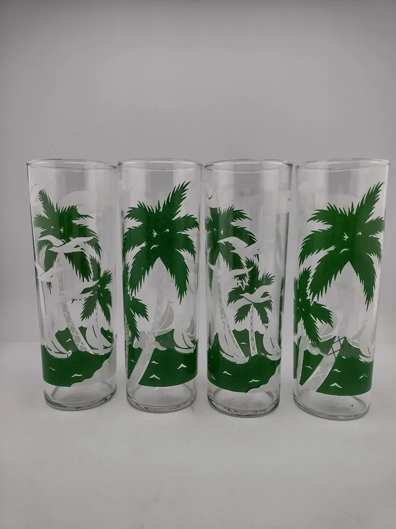 Libbey Collins Palm Trees and Birds HiBall Glasses Set of 4 are in great condition. Very minor wear as shown in photos.