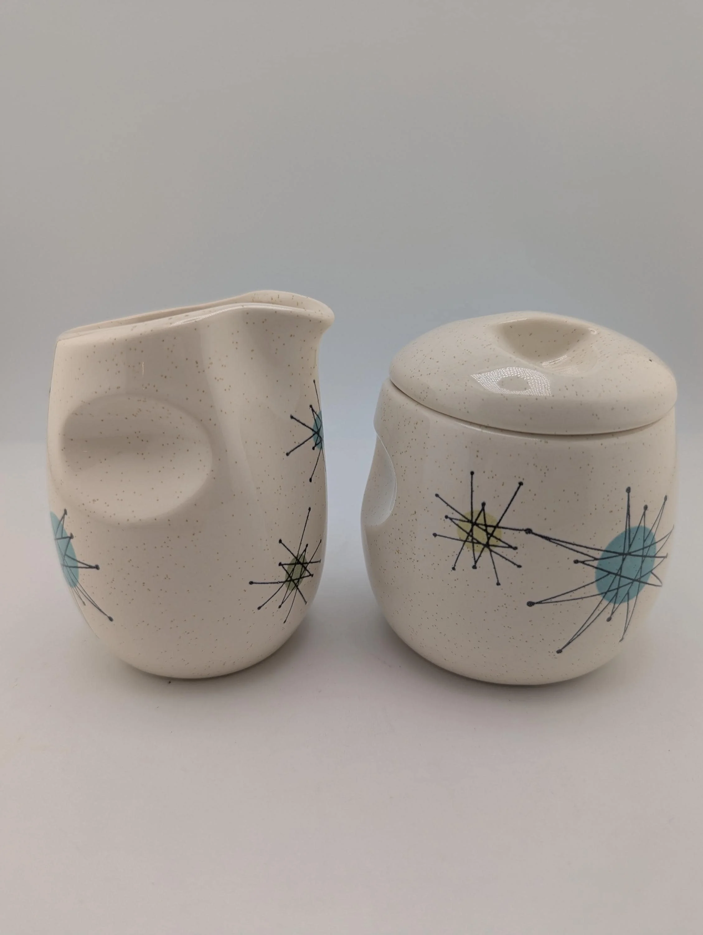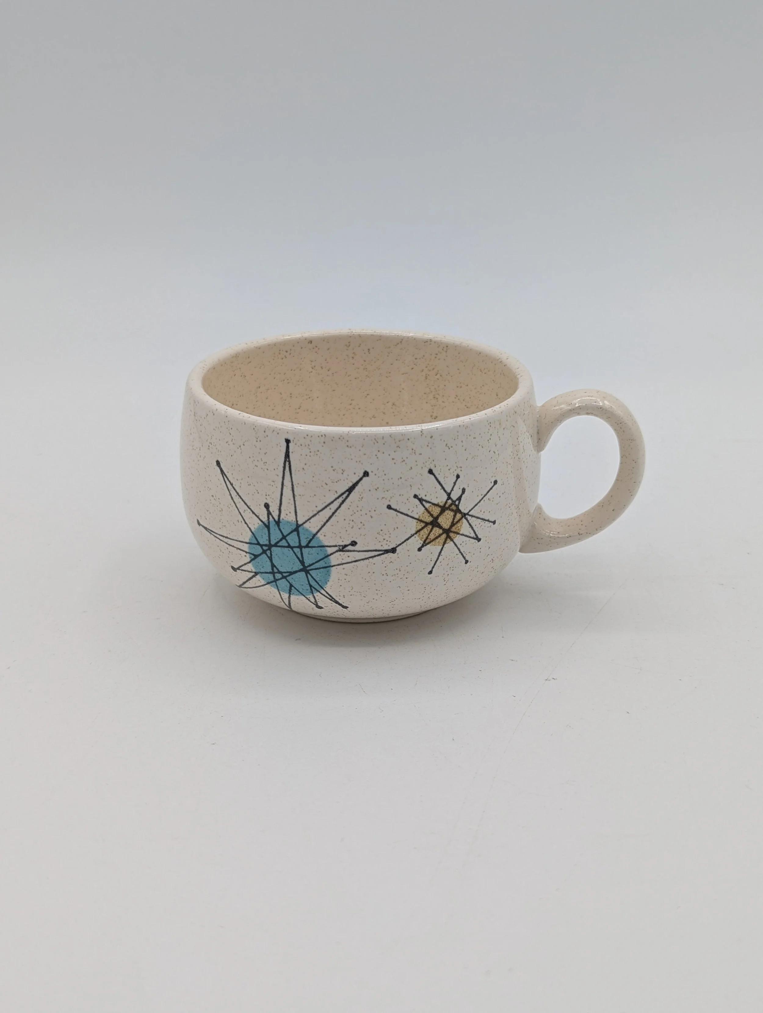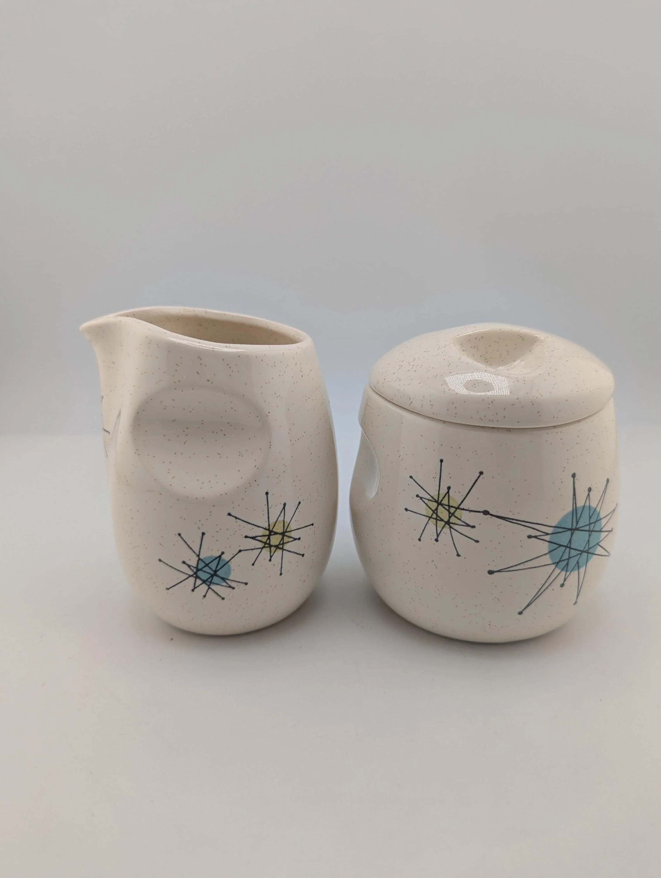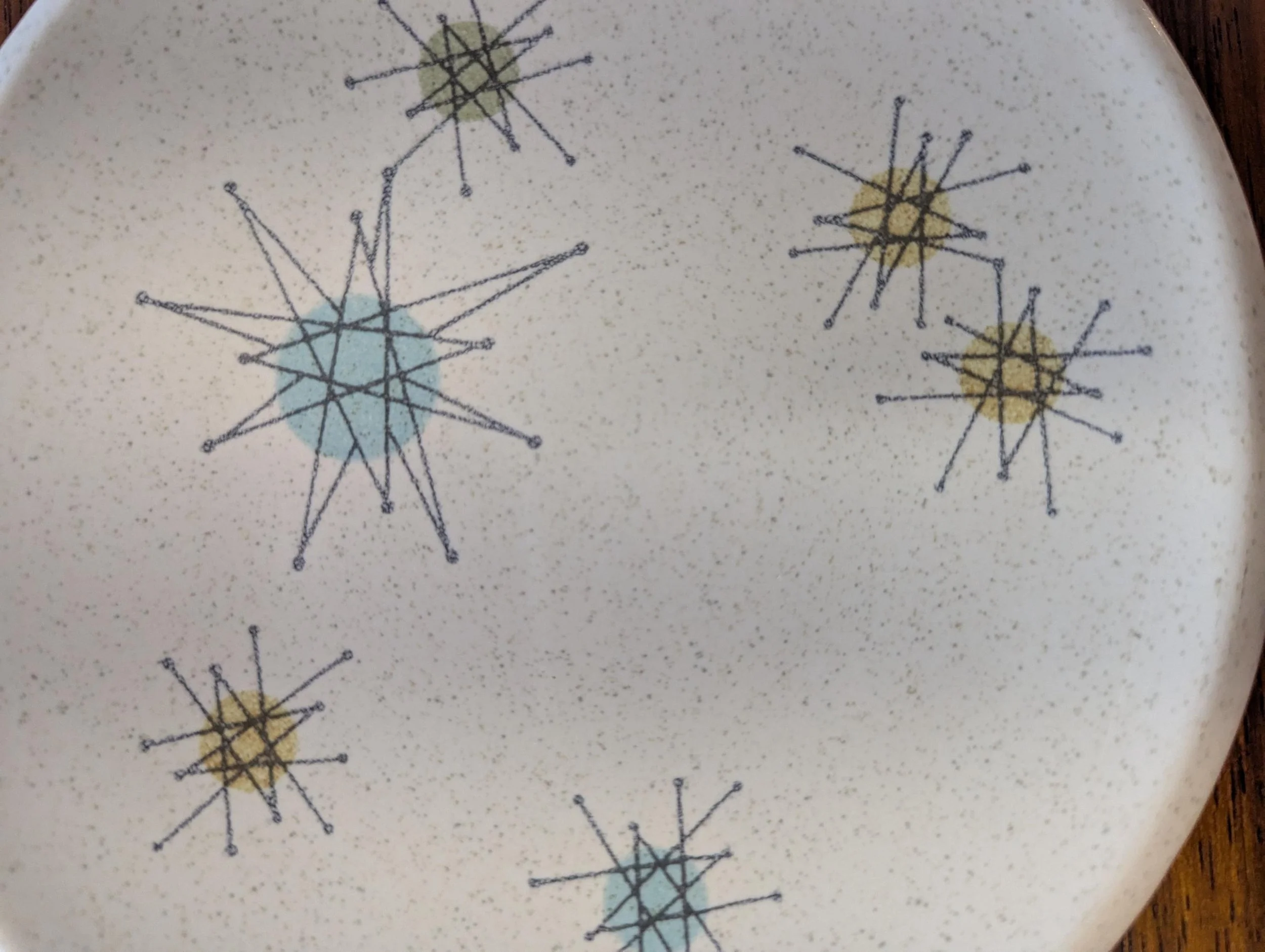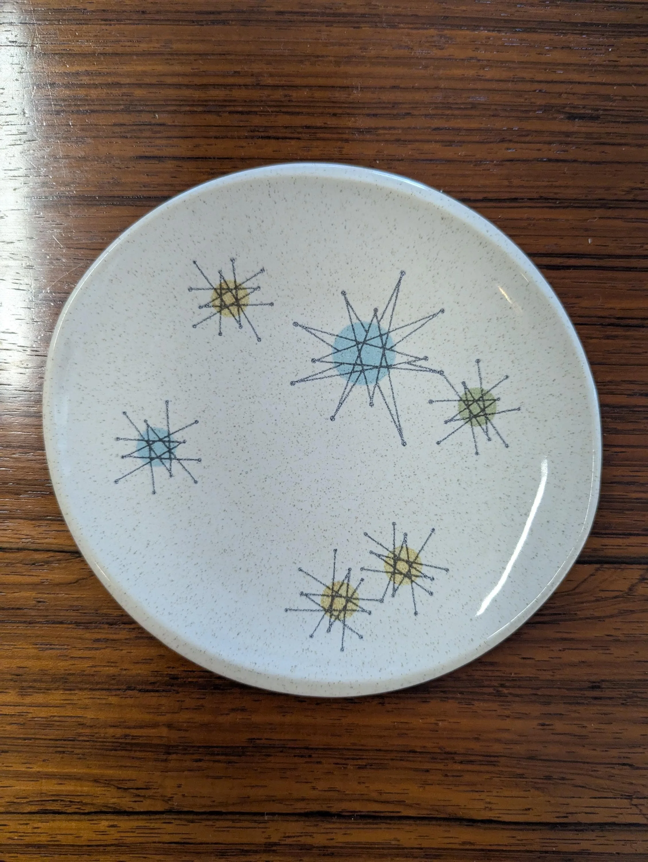 The Franciscan Starburst dinnerware pattern, released in 1954, is an iconic mid-century modern design with a futuristic, space-age aesthetic, featuring a cream-colored, speckled background with bold, yellow, blue, and green starburst details.