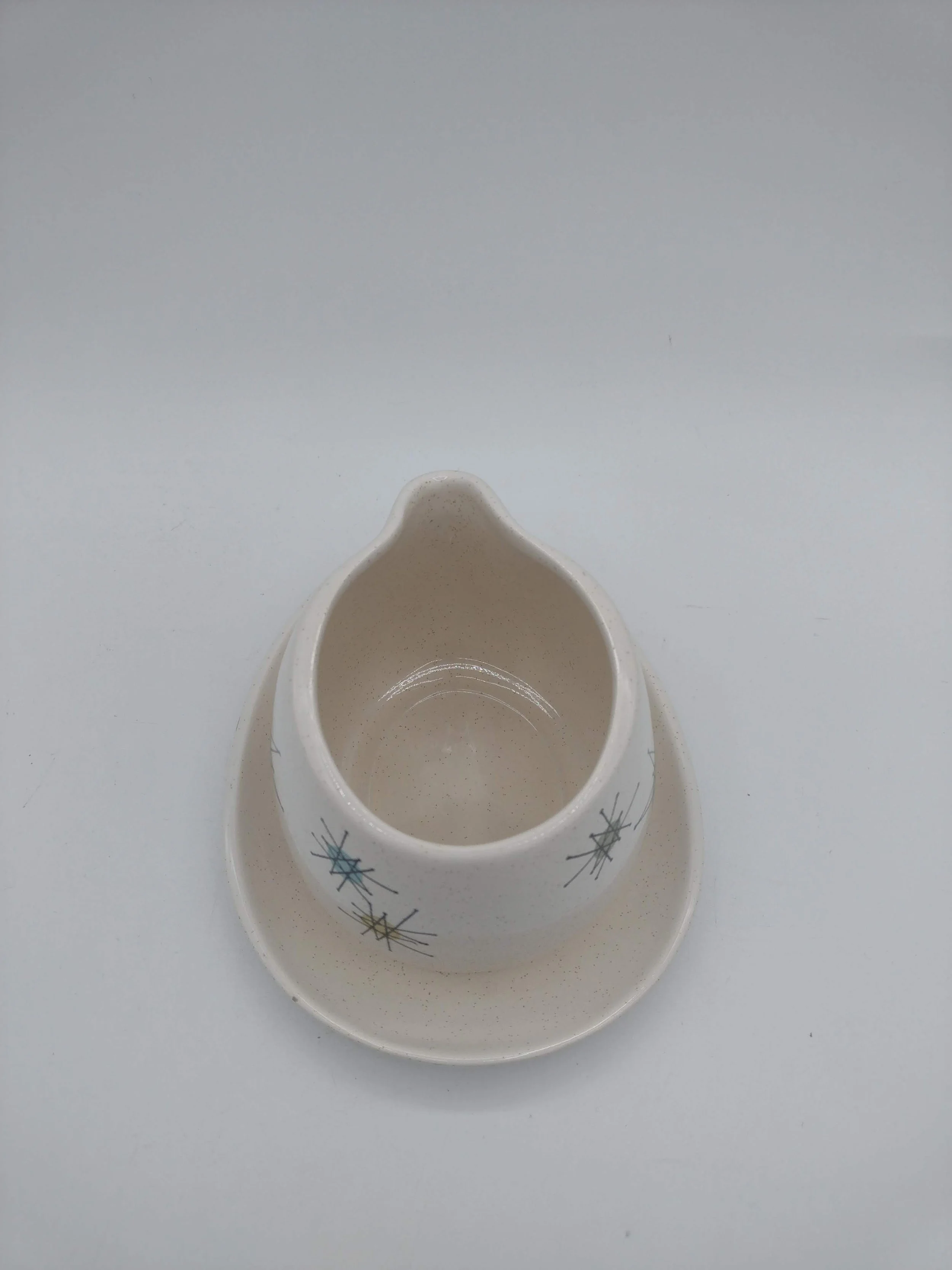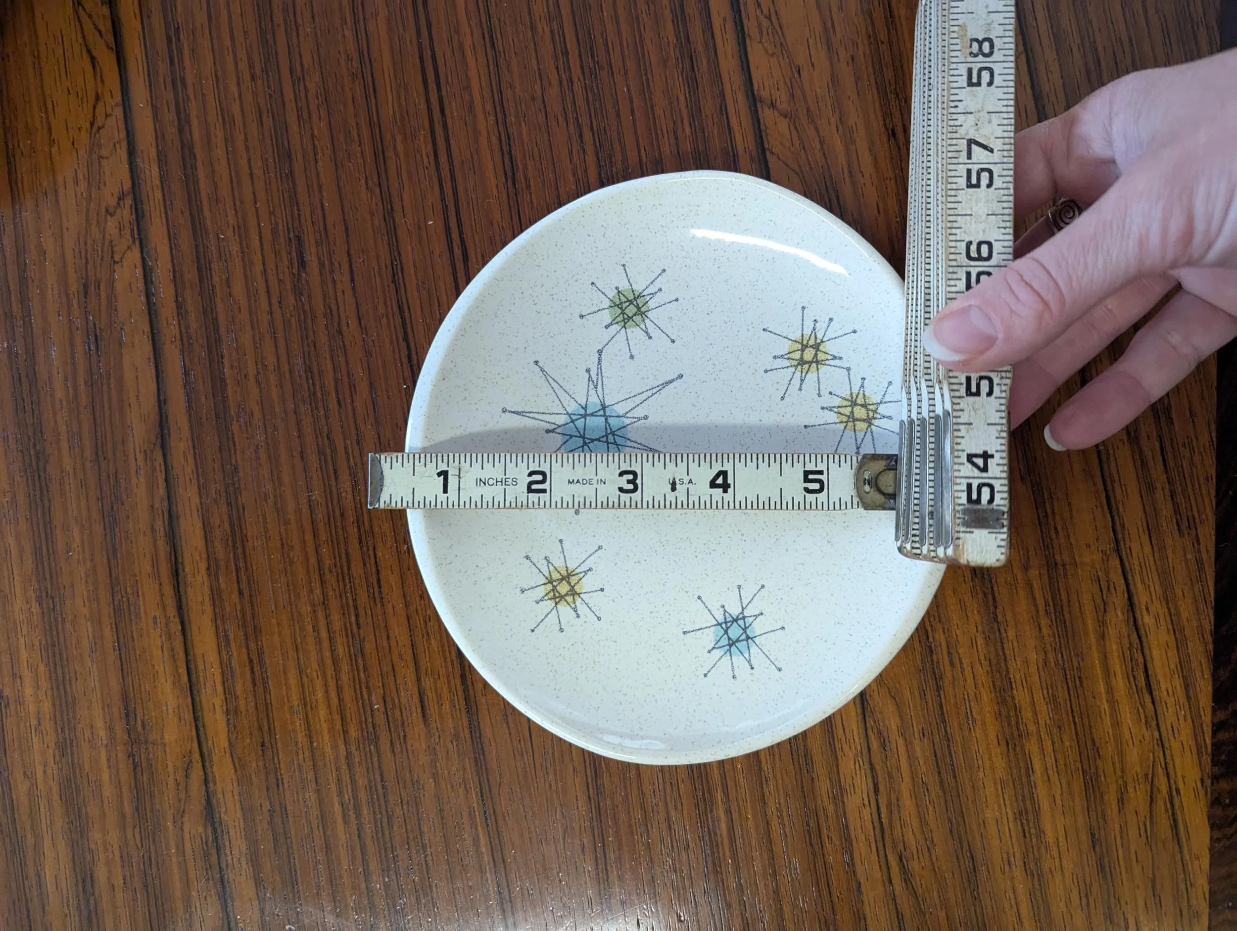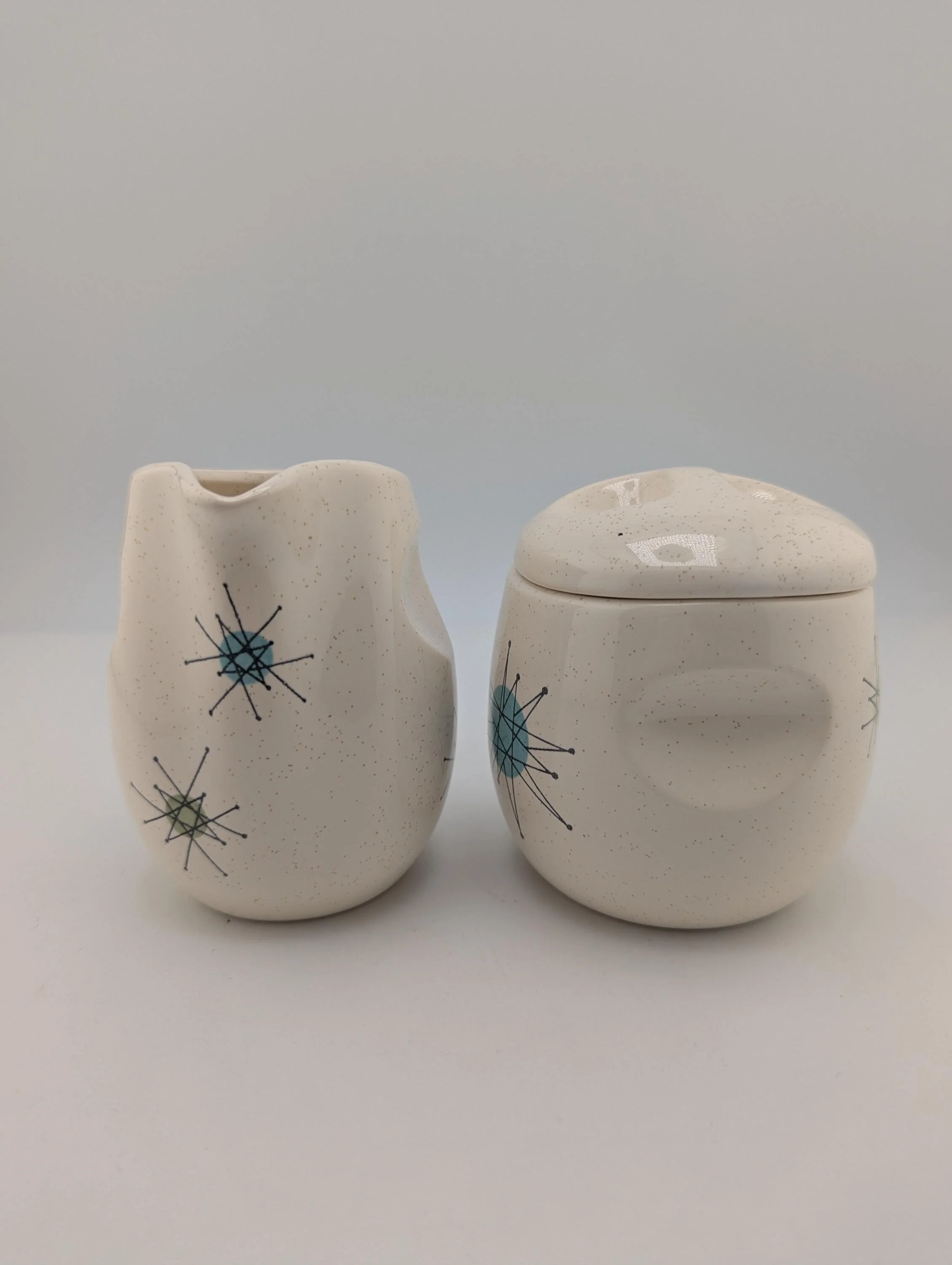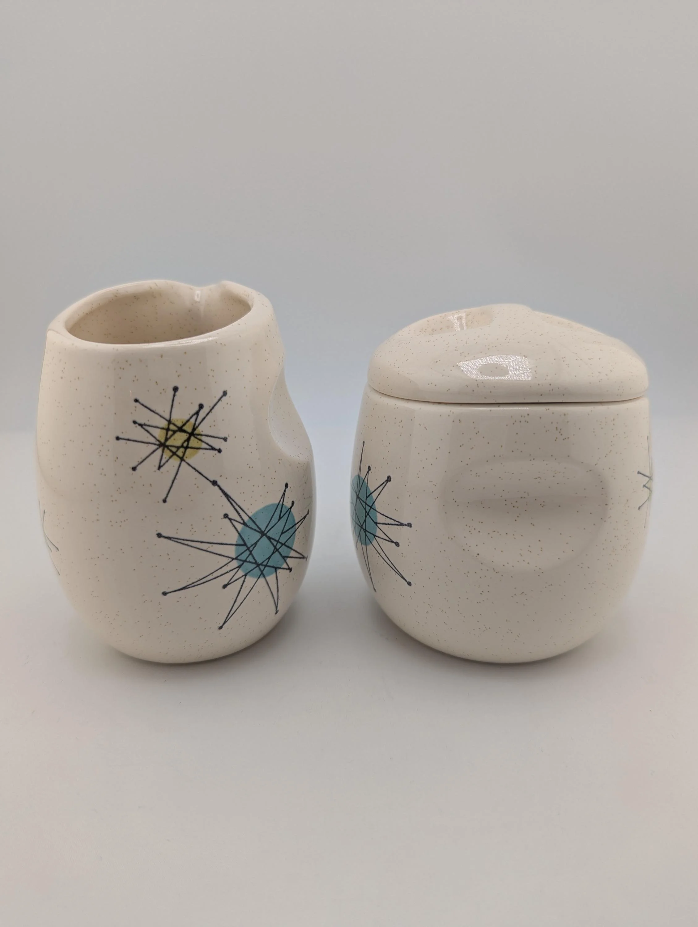 The Franciscan Starburst dinnerware pattern, released in 1954, is an iconic mid-century modern design with a futuristic, space-age aesthetic, featuring a cream-colored, speckled background with bold, yellow, blue, and green starburst details.