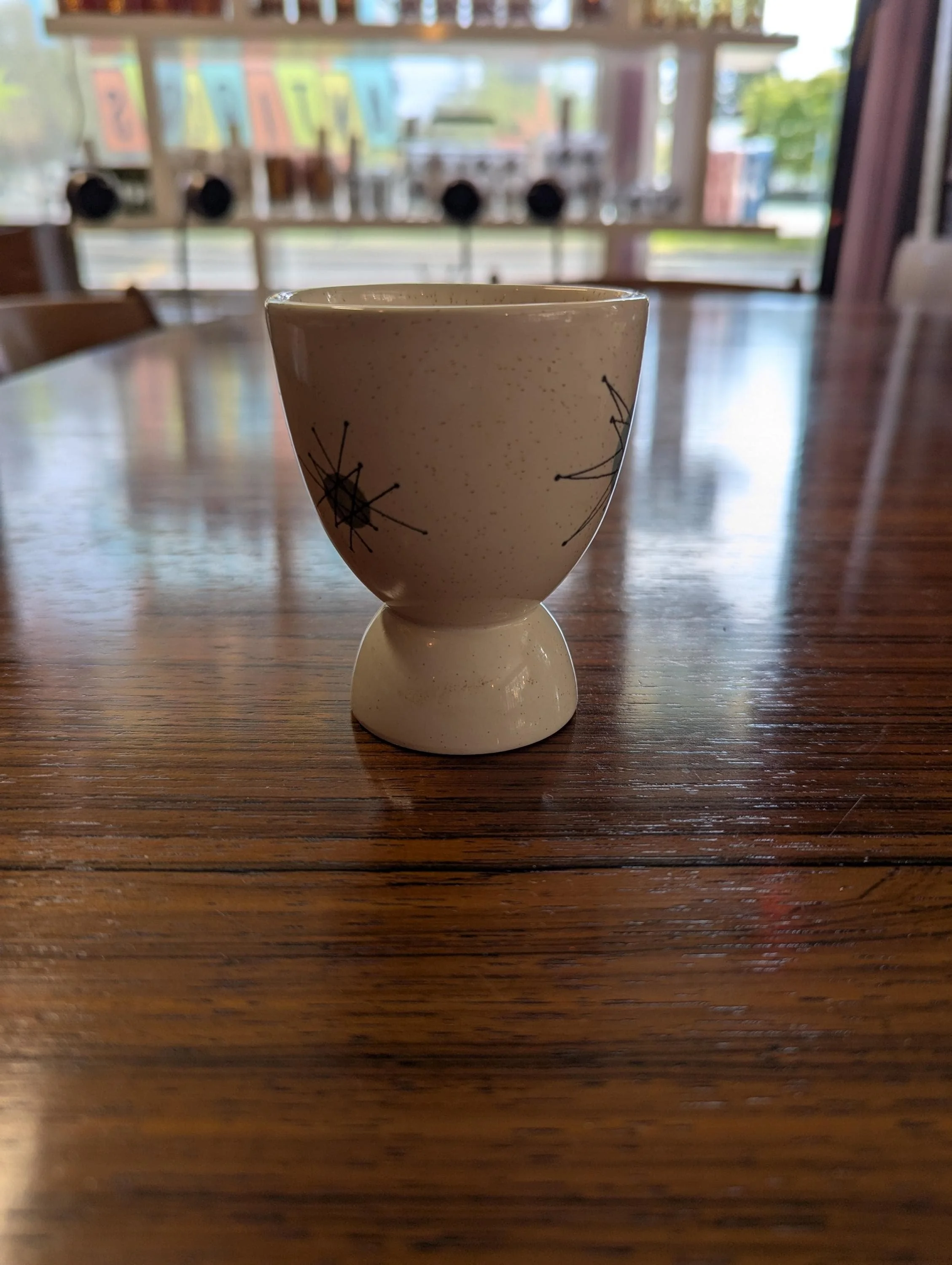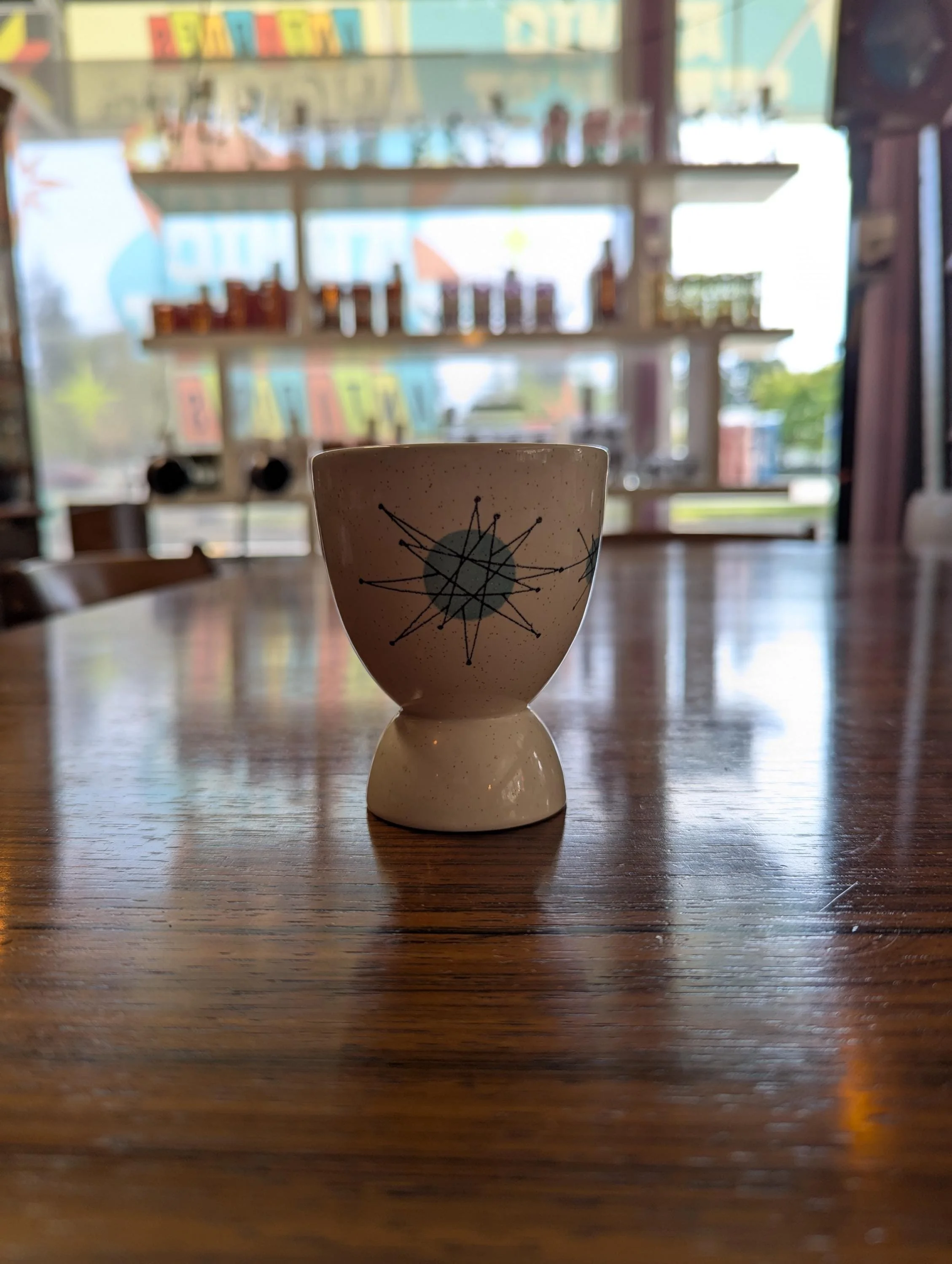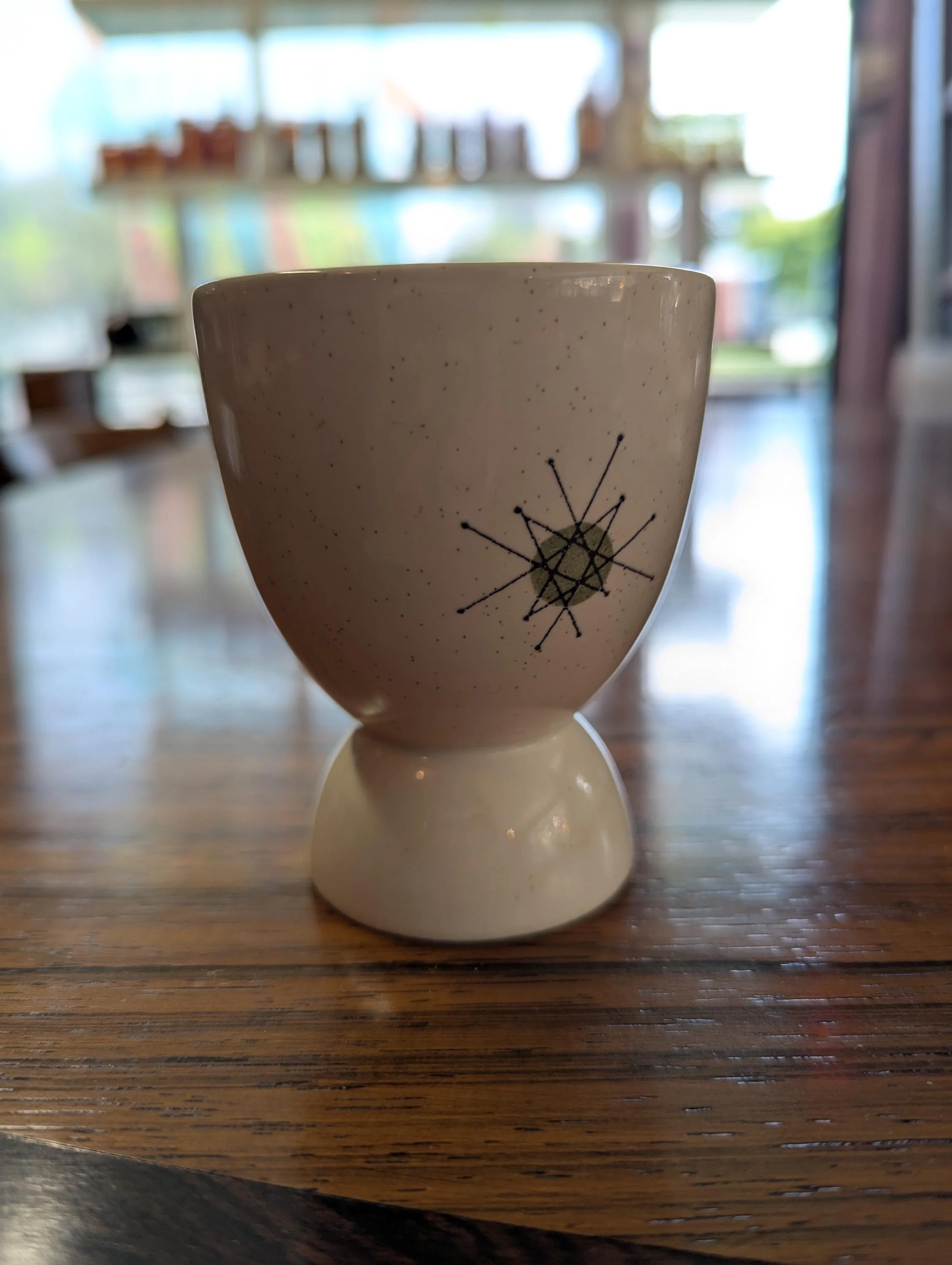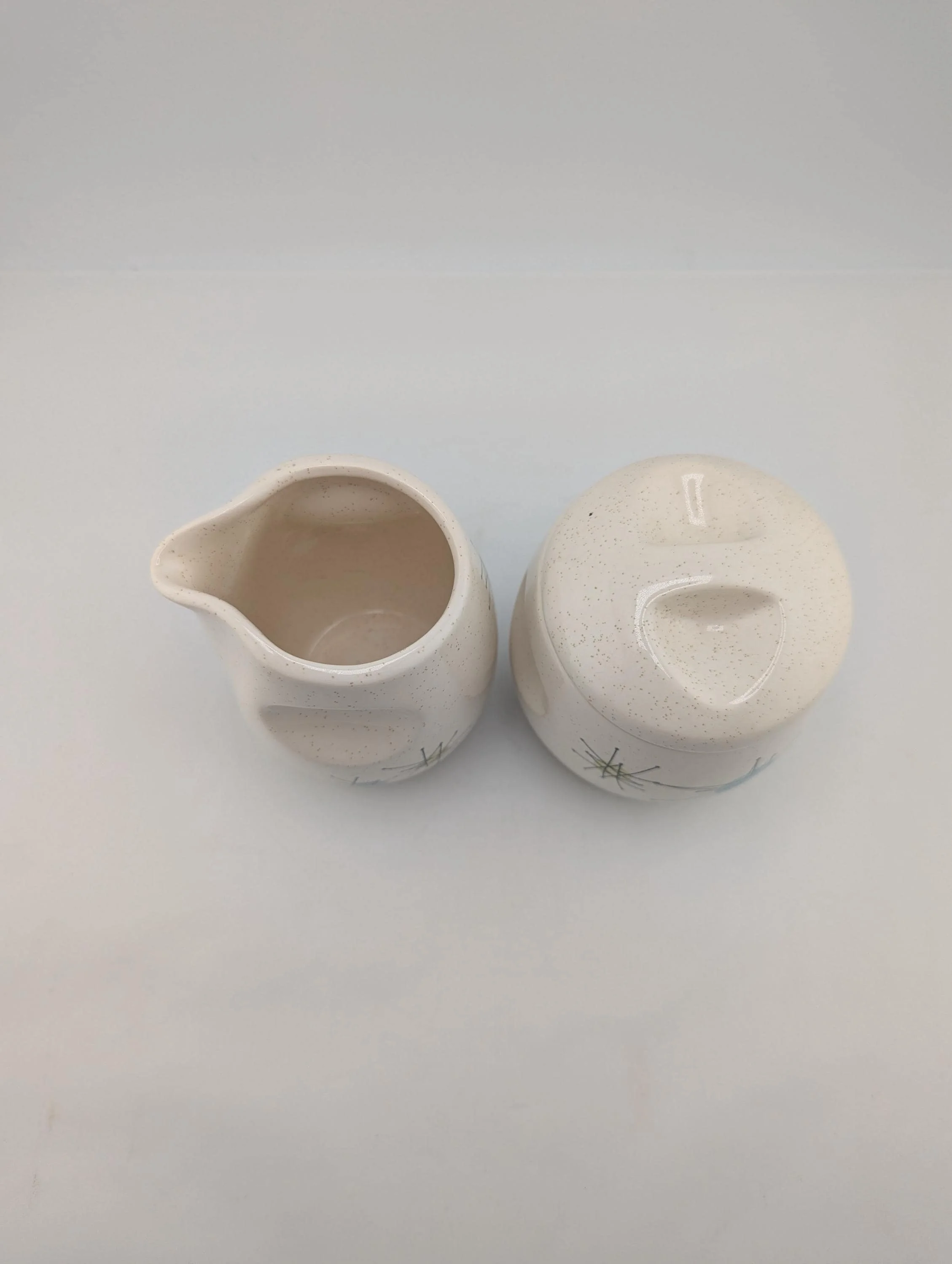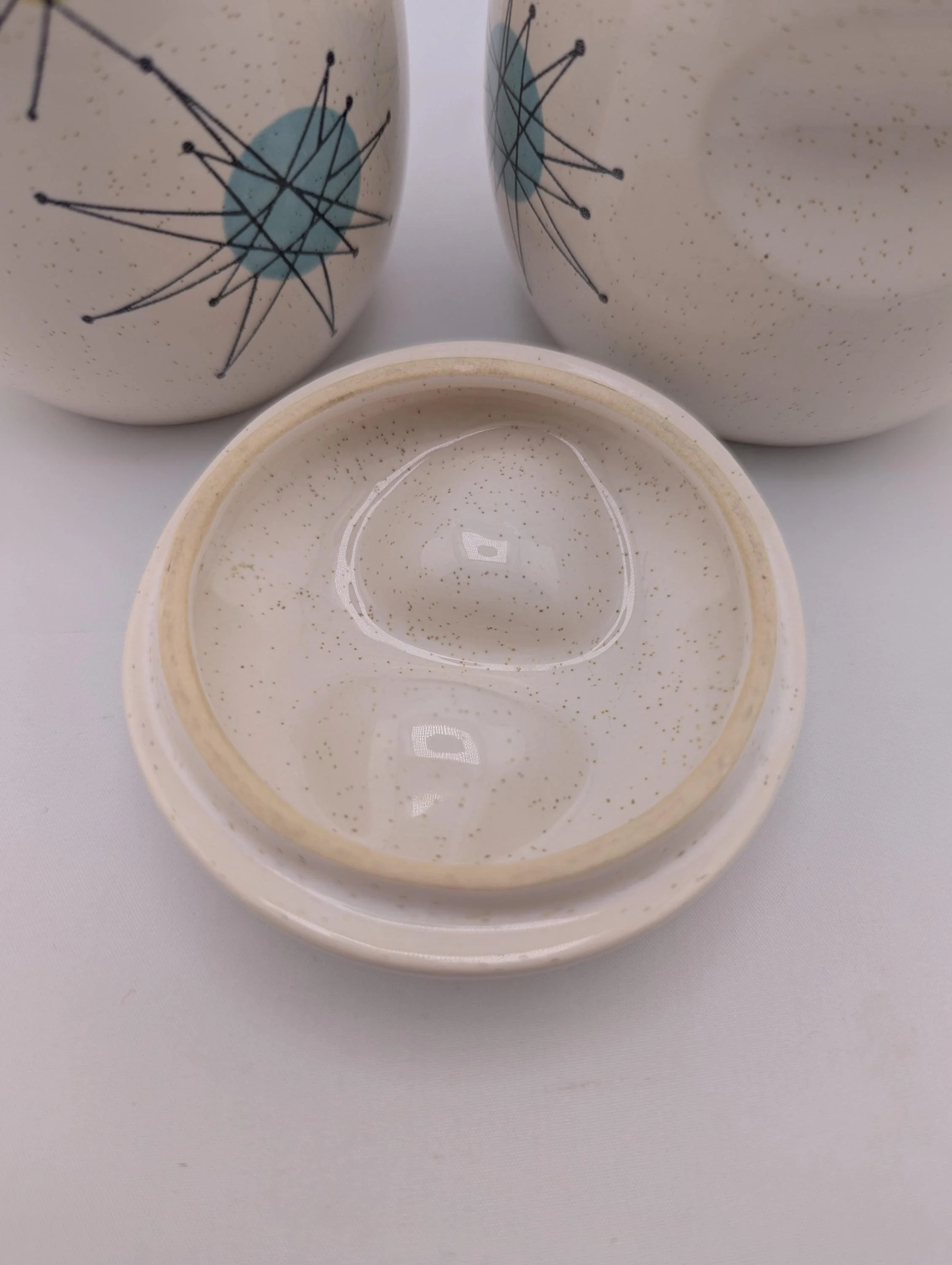 The Franciscan Starburst dinnerware pattern, released in 1954, is an iconic mid-century modern design with a futuristic, space-age aesthetic, featuring a cream-colored, speckled background with bold, yellow, blue, and green starburst details.