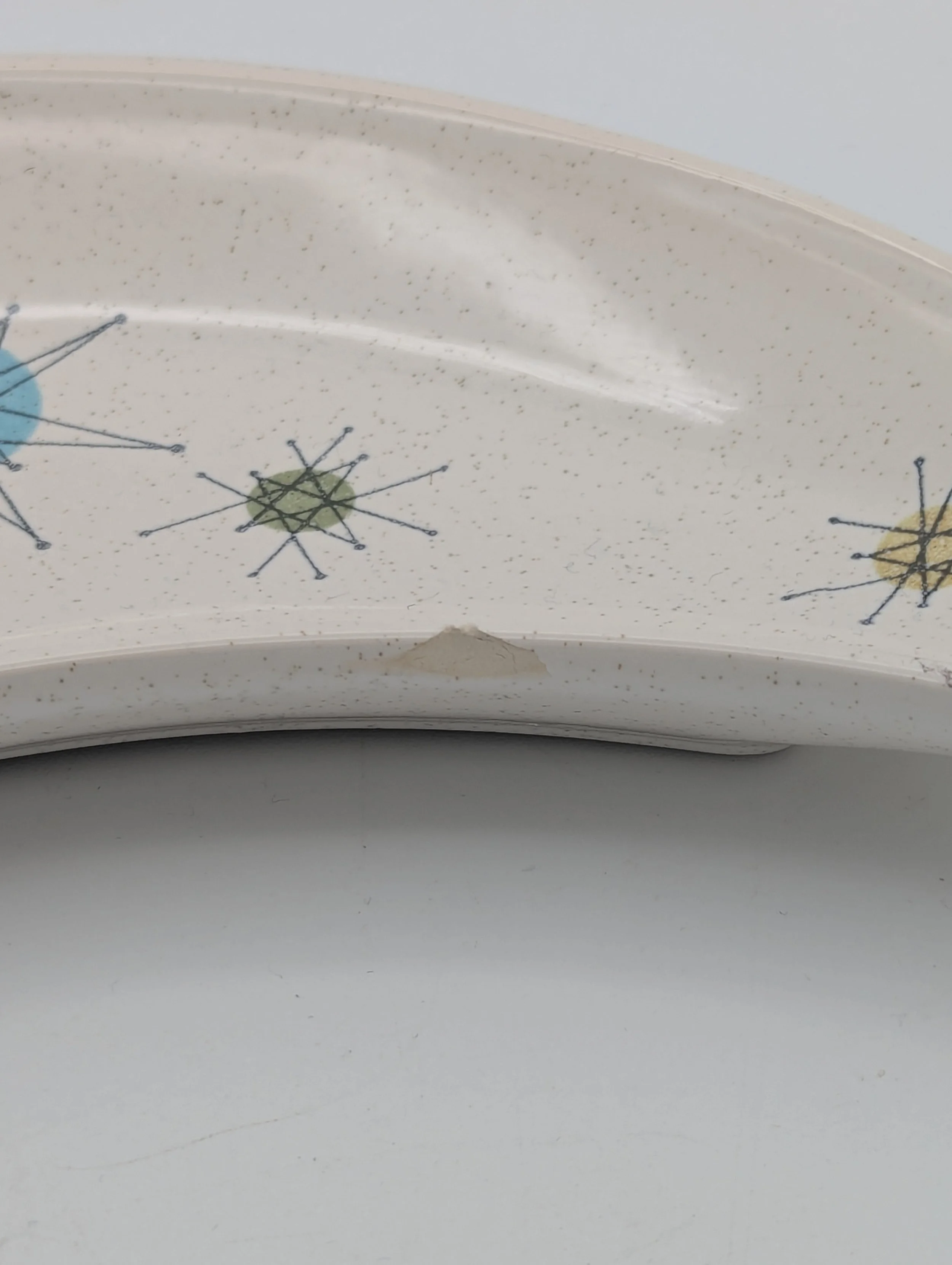 The Franciscan Starburst dinnerware pattern, released in 1954, is an iconic mid-century modern design with a futuristic, space-age aesthetic, featuring a cream-colored, speckled background with bold, yellow, blue, and green starburst details.