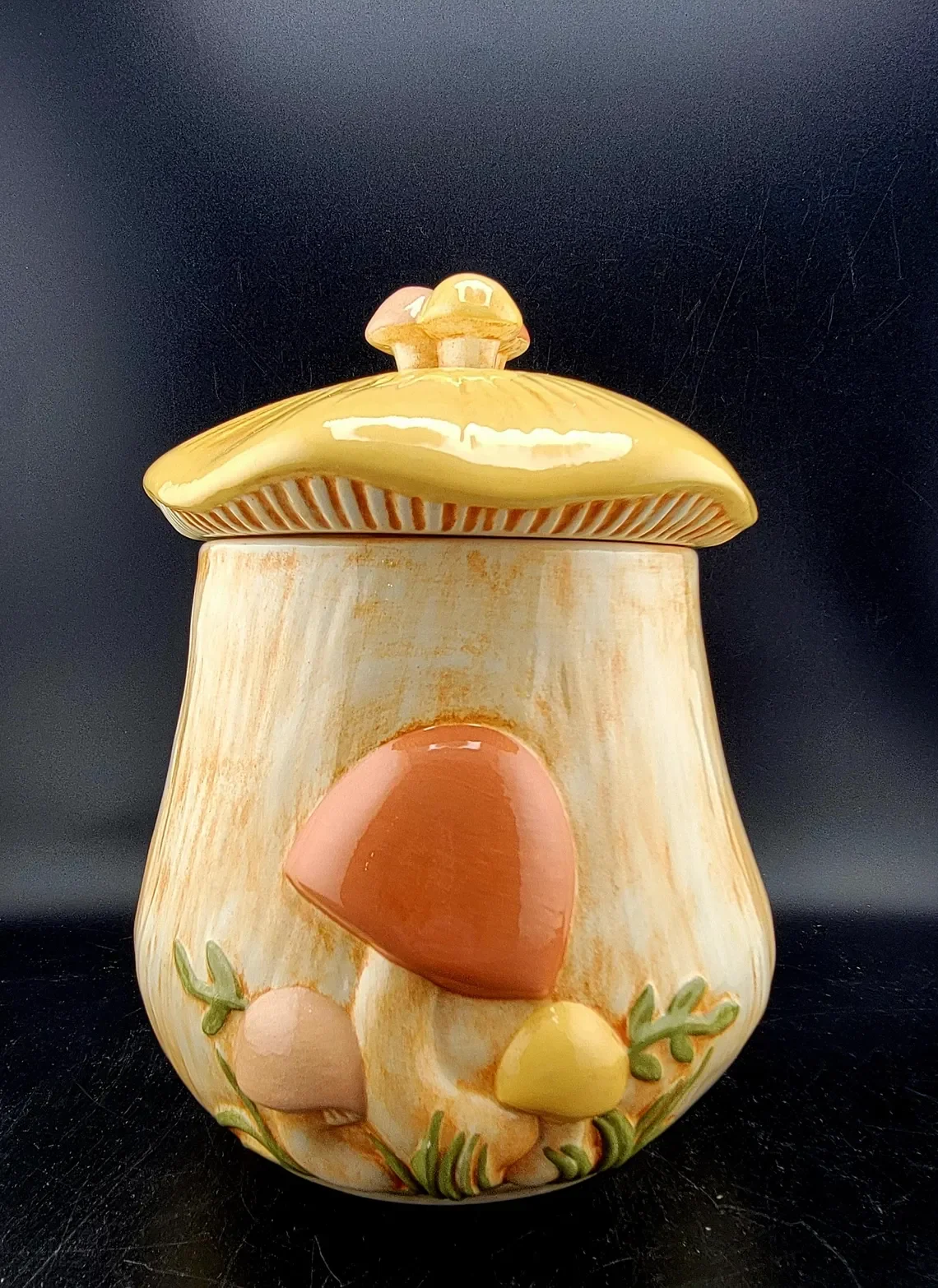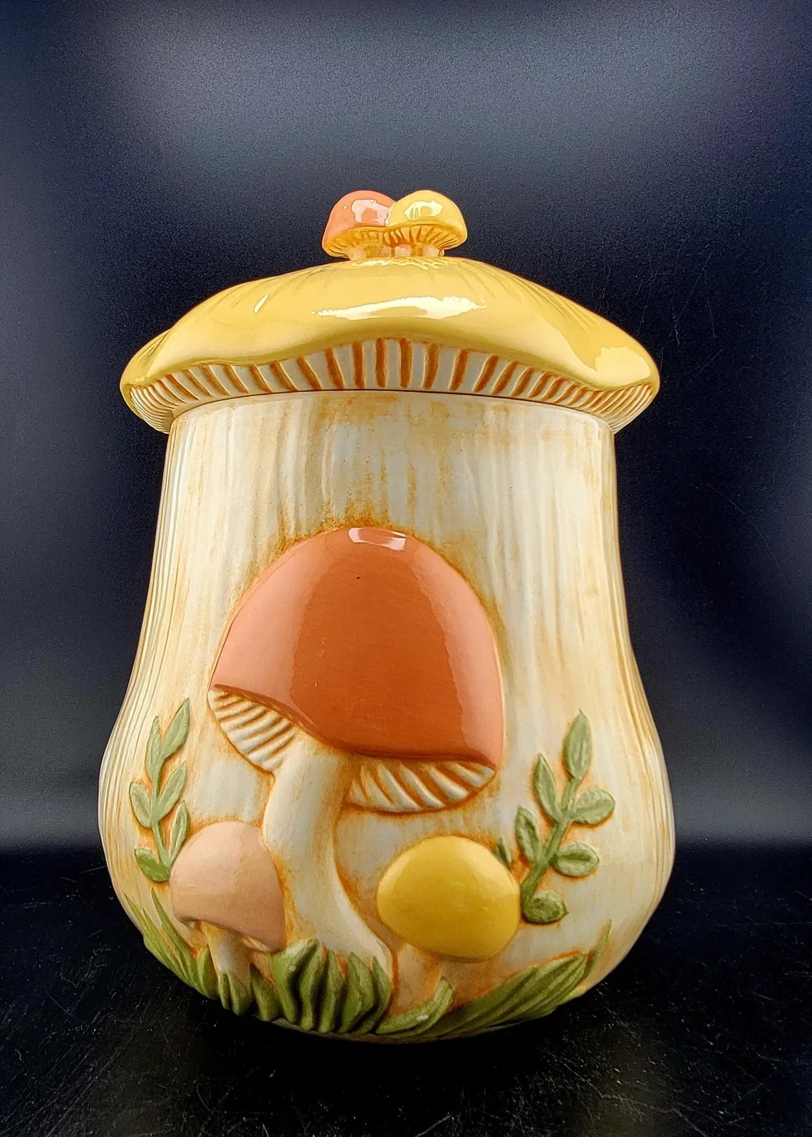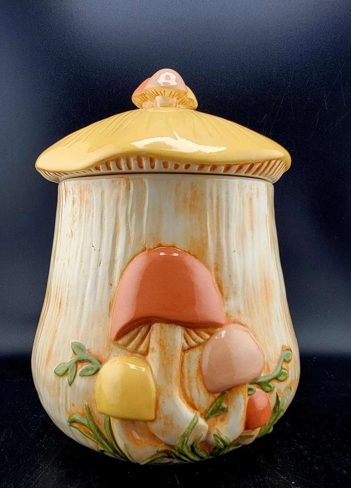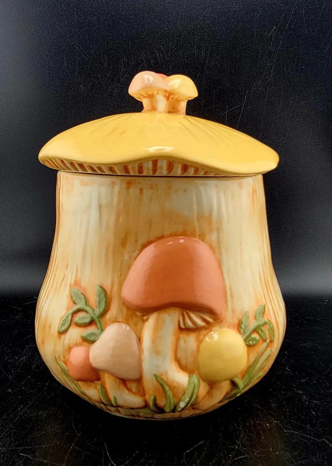 Beautiful Vintage MCM Arnel Mushroom Canisters, Set of 4 with lids. Hairline cracks in small canister, as shown in photos.
