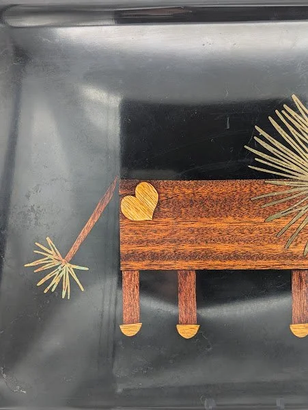 Made with Teak and Gold. Dimensions are 18 inches Long by 12 inches Wide. Please see photos for condition.