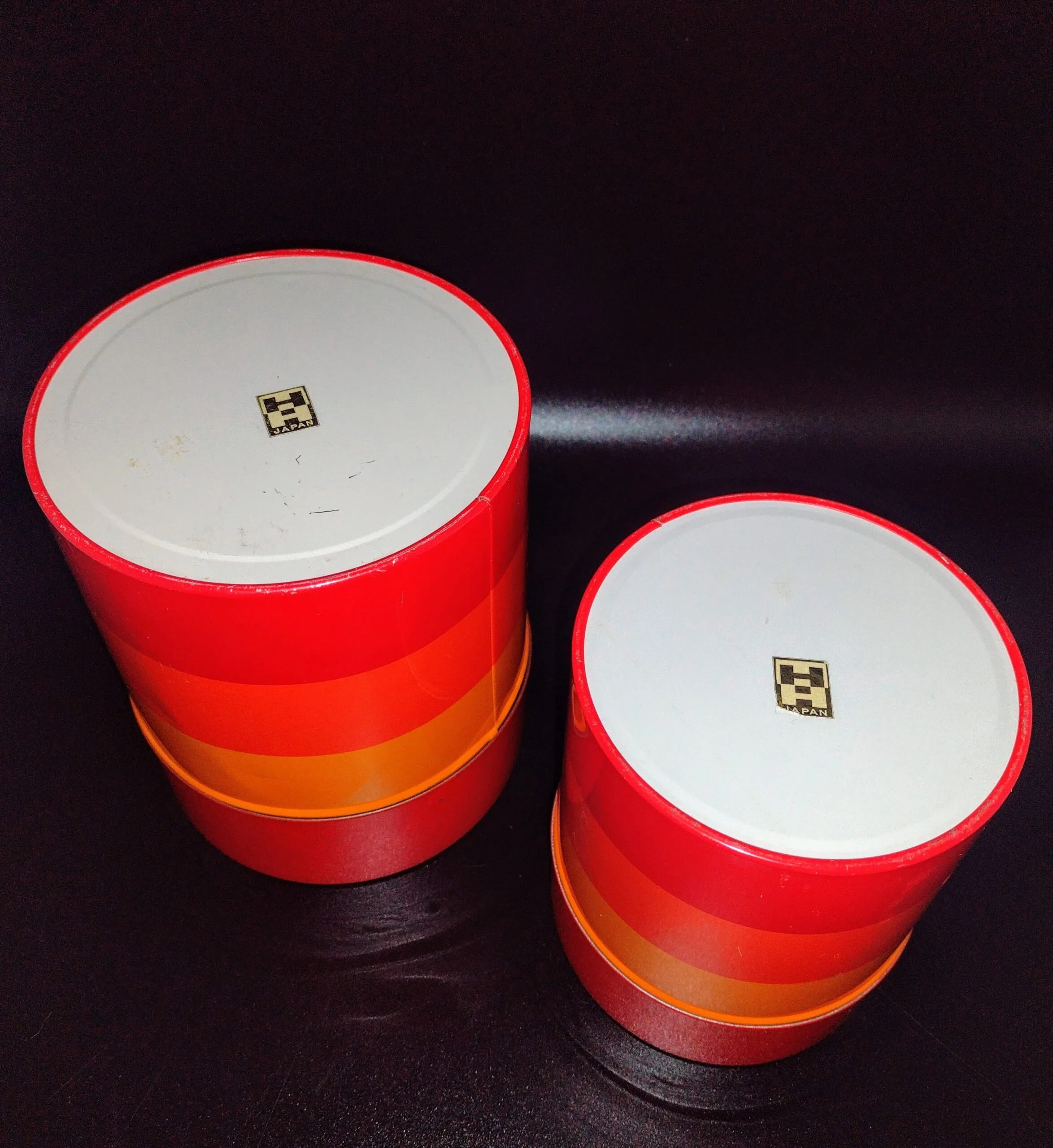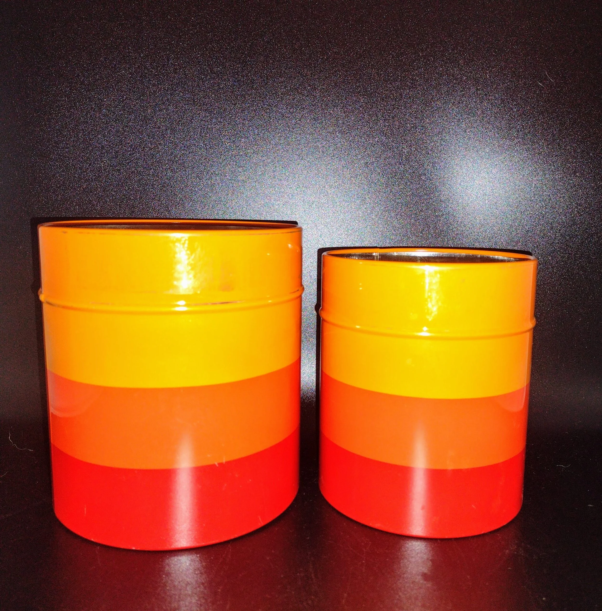 Vintage MCM Canisters in Red, Orange and Yellow. Set of 2. Some scratches and wear as shown in photos. Height: Large Canister 6 inches, Small Canister 5.25 inches.