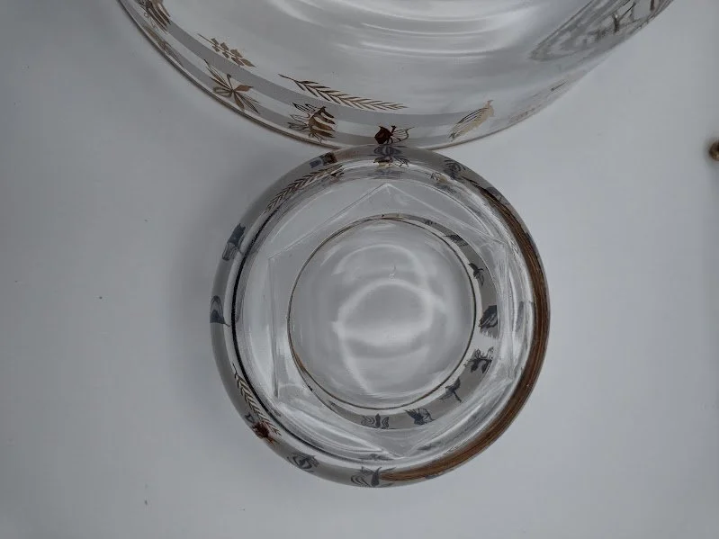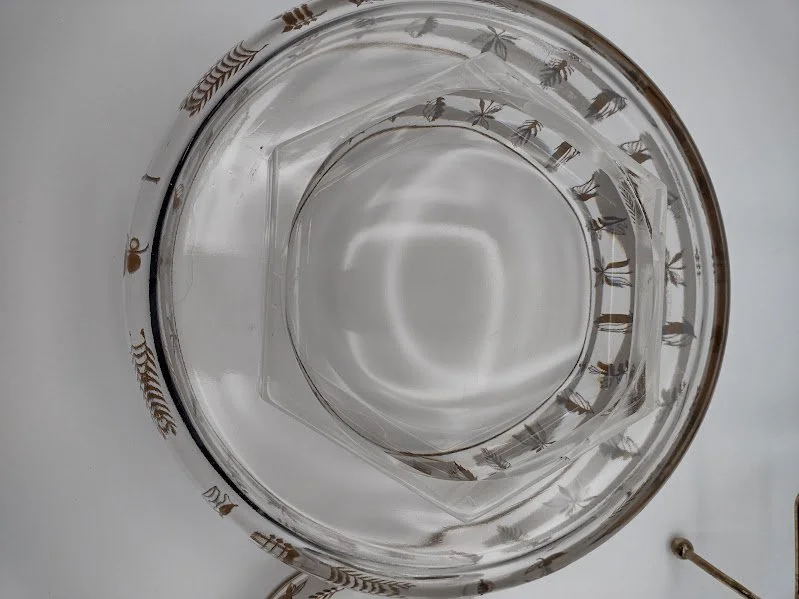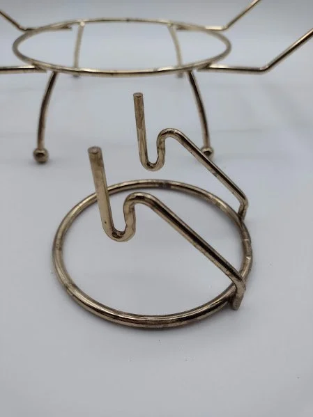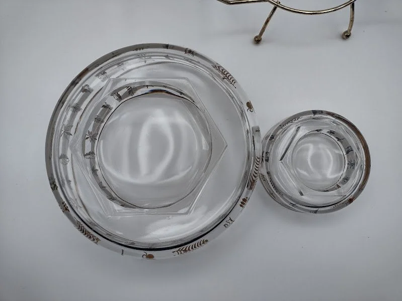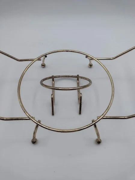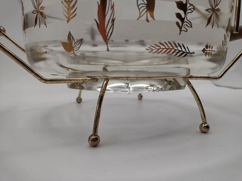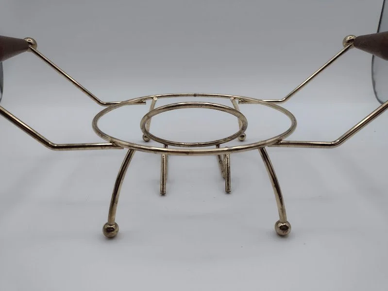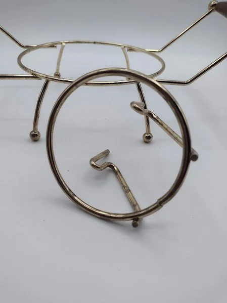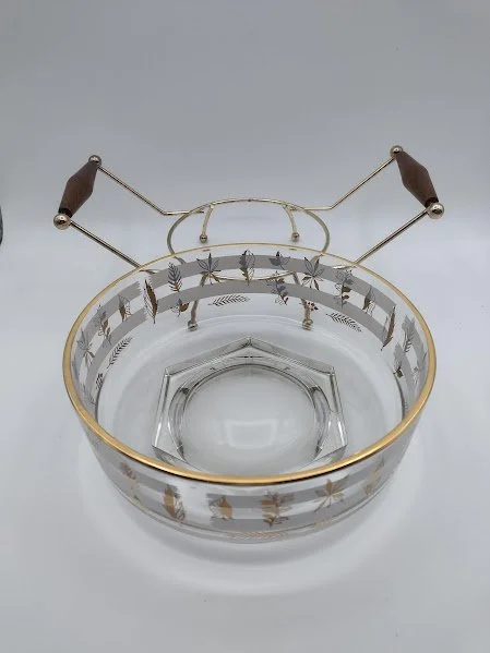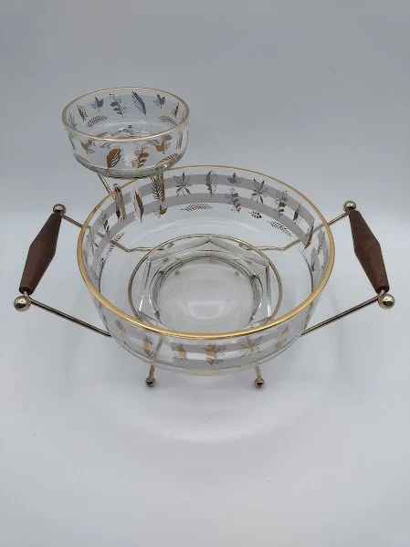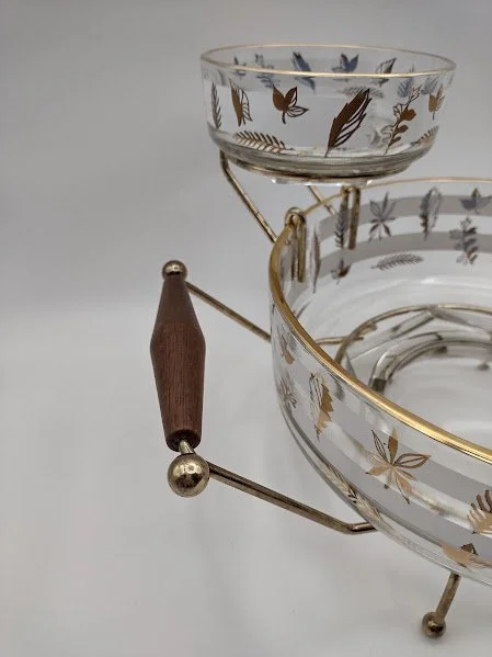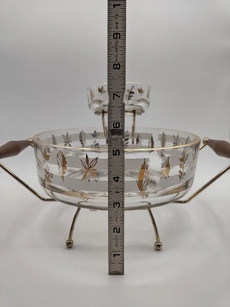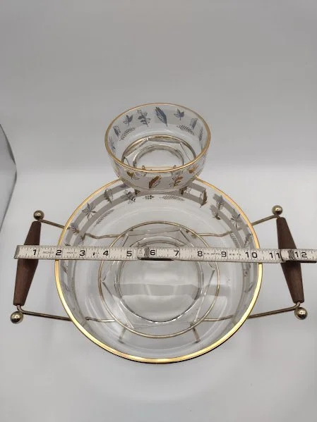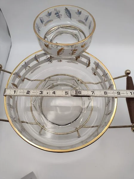 Comes with teak and metal holders for the glass bowls. Please see photos for details and dimensions.